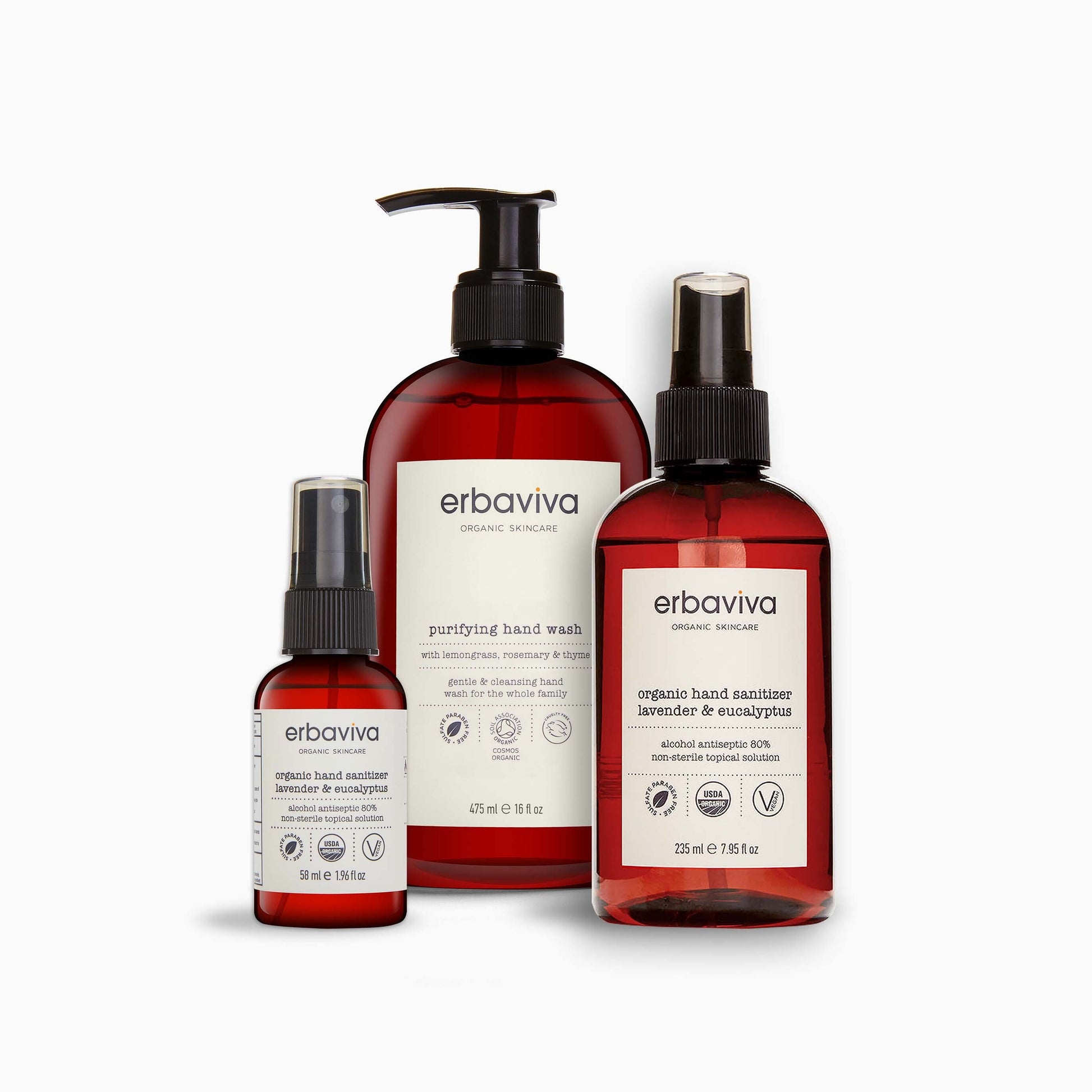 clean hands are more important than ever. and frequent disinfecting can cause them to dry and crack in these cold winter months. so, we created an SOS hand sanitizer bundlet hat includes our 7.95 fl oz Certified Organic Hand Hand Sanitizer, our 16 fl oz Purifying Hand Wash, and a Travel Size Organic Sanitizer for on-the-go. All products in this organic disinfectant bundle are safe, clean and non-drying to protect your health and your skin.